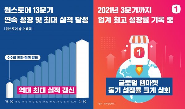 수수료 인하 정책을 처음 시행한 2018년 2분기 이후 3년 이상 매분기 거래액 기록을 다시 세웠다. 빅데이터 플랫폼 기업 아이지에이웍스가 앱마켓 3사의 거래액을 추정해 발표하는 모바일인덱스 기준으로 2021년 초부터 3분기까지 원스토어의 성장률은 전년 동기 대비 36.1%로, 다른 글로벌 앱마켓의 동기 성장률 25%를 크게 웃돌았다.