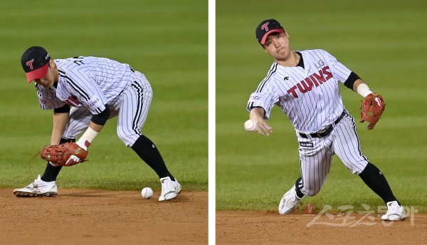 25일 서울 잠실야구장에서 ‘2021 신한은행 SOL KBO리그’ 롯데 자이언츠와 LG 트윈스 경기가 열렸다. 3회초 1사 1,3루 LG 구본혁이 땅볼 타구을 놓쳤다 다시 잡아 2루로 송구하고 있다.