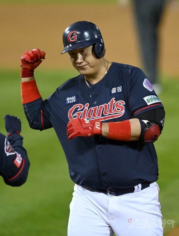 25일 서울 잠실야구장에서 ‘2021 신한은행 SOL KBO리그’ 롯데 자이언츠와 LG 트윈스 경기가 열렸다. 3회초 무사 1루 롯데 이대호가 중전 안타를 치고 1루에서 기뻐하고 있다.