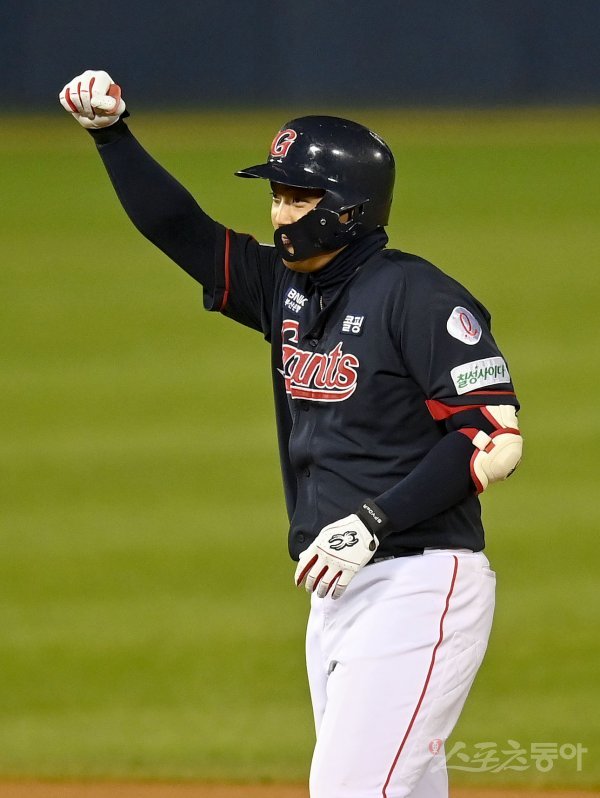 25일 서울 잠실야구장에서 ‘2021 신한은행 SOL KBO리그’ 롯데 자이언츠와 LG 트윈스 경기가 열렸다. 8회초 1사 1루 롯데 한동희가 동점을 만드는 중전 2루타를 치고 2루에서 기뻐하고 있다.