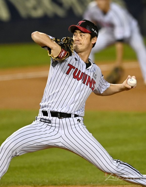 25일 서울 잠실야구장에서 ‘2021 신한은행 SOL KBO리그’ 롯데 자이언츠와 LG 트윈스 경기가 열렸다. 8회초 교체 등판한 LG 진해수가 역투하고 있다.