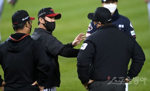 25일 서울 잠실야구장에서 ‘2021 신한은행 SOL KBO리그’ 롯데 자이언츠와 LG 트윈스 경기가 열렸다. LG 유지현 감독이 7회초 무사 1루 롯데 마차도 내야 땅볼 후 주루플레이의 수비 방해에 대해 항의하고 있다.