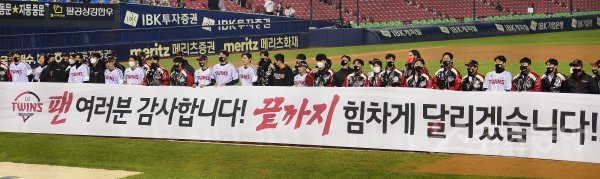 25일 서울 잠실야구장에서 ‘2021 신한은행 SOL KBO리그’ 롯데 자이언츠와 LG 트윈스 경기가 열렸다. 시즌 홈 마지막 경기를 마친 LG 선수들이 팬들에게 인사하고 있다.