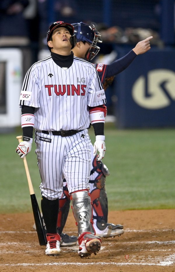 25일 서울 잠실야구장에서 ‘2021 신한은행 SOL KBO리그’ 롯데 자이언츠와 LG 트윈스 경기가 열렸다. 4-4 동점인 9회말 1사 2루 LG 유강남이 삼진 아웃을 당한 후 아쉬워하고 있다.