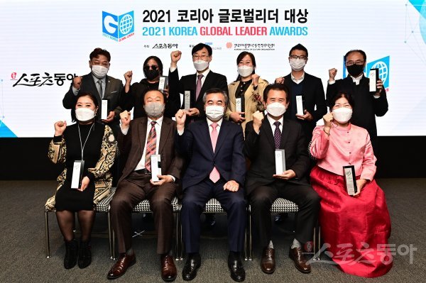 ‘2021 코리아 글로벌리더 대상(주최:스포츠동아, 후원:국립국제교육원, 코리아문화수도조직위원회)’ 시상식이 26일 서울 중구 을지로 서울더존을지타워에서 열렸다. 새명에너지테크그룹 박희수 회장을 대신해 수상한 박해준 씨, 예술인 최은하 씨, 한국줄기세포임상의학회 최승호 회장, 사쿠라인터내셔널 장성희 대표, ㈜우아헬스케어 전은표 대표, 일본 웹코믹스 신형준 대표, 국제 산야초연구소 김민서 대표, 하나님의교회 세계복음 선교 협회 김중락 목사, 스포츠동아 이인철 대표, 가교금거래소 박현강 대표, 중국동포연합중앙회 여성회 린다리 회장(윗줄 왼쪽부터 시계 방향으로)이 기념 촬영을 하고 있다.