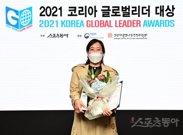 ‘2021 코리아 글로벌리더 대상(주최:스포츠동아, 후원:국립국제교육원, 코리아문화수도조직위원회)’ 시상식이 26일 서울 중구 을지로 서울더존을지타워에서 열렸다. 여성리더 부문 대상을 수상한 사쿠라인터내셔널 장성희 대표가 기념 촬영을 하고 있다.