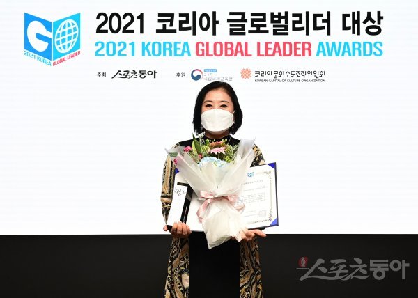 ‘2021 코리아 글로벌리더 대상(주최:스포츠동아, 후원:국립국제교육원, 코리아문화수도조직위원회)’ 시상식이 26일 서울 중구 을지로 서울더존을지타워에서 열렸다. 여성리더 부문 대상을 수상한 중국동포연합중앙회 여성회 린다리 회장이 기념 촬영을 하고 있다.