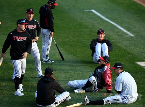 26일 대전 한화생명이글스파크에서 ‘2021 신한은행 SOL KBO리그’ 한화 이글스와 LG 트윈스의 경기가 열린다. 경기 전 야구장에 늦게 도착한 LG 선수들이 스트레칭으로 몸을 풀고 있다.