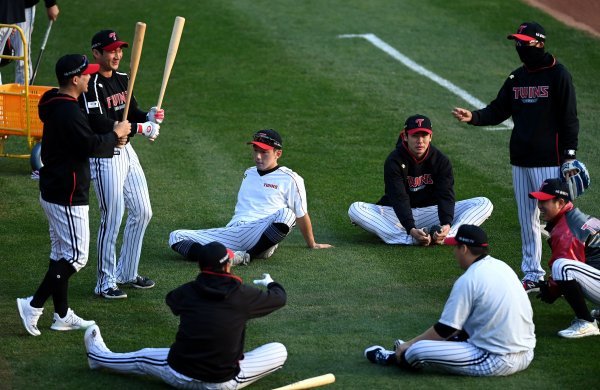 26일 대전 한화생명이글스파크에서 ‘2021 신한은행 SOL KBO리그’ 한화 이글스와 LG 트윈스의 경기가 열린다. 경기 전 야구장에 늦게 도착한 LG 선수들이 스트레칭으로 몸을 풀고 있다.