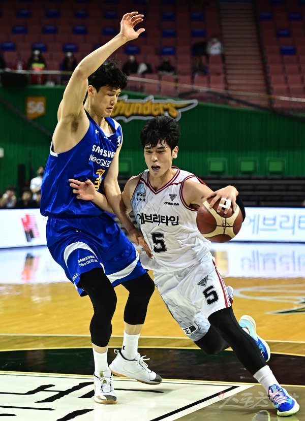 26일 서울 잠실실내체육관에서 열린 ‘2021-2022 KGC 인삼공사 정관장 프로농구’ 서울 삼성과 안양 KGC의 경기에서 KGC 변준형이 삼성 장민국의 수비를 뚫고 돌파하고 있다.