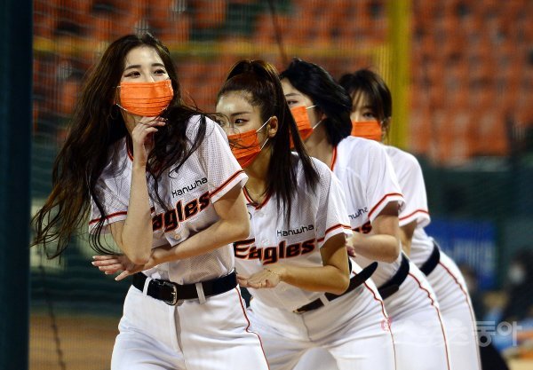 26일 대전 한화생명이글스파크에서 ‘2021 신한은행 SOL KBO리그’ 한화 이글스와 LG 트윈스의 경기가 열렸다. 한화 치어리더가 화려한 공연을 선보이고 있다.