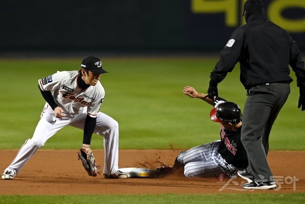 26일 대전 한화생명이글스파크에서 ‘2021 신한은행 SOL KBO리그’ 한화 이글스와 LG 트윈스의 경기가 열렸다. 1회초 1사 1루에서 LG 서건창이 2루 도루를 성공시키고 있다.