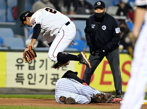 26일 대전 한화생명이글스파크에서 ‘2021 신한은행 SOL KBO리그’ 한화 이글스와 LG 트윈스의 경기가 열렸다. 6회초 2사 2, 3루에서 한화 김태연이 LG 채은성을 견제 아웃시키고 있다.
