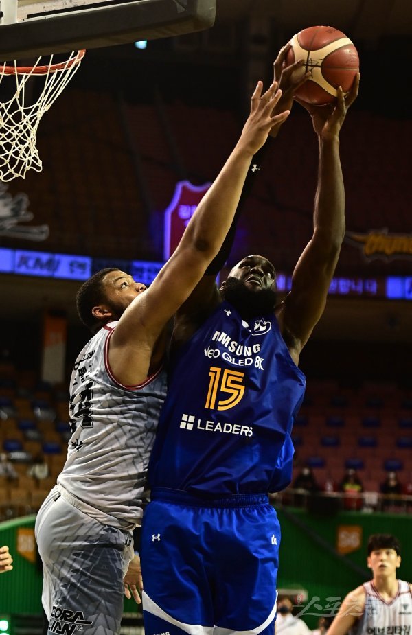 26일 서울 잠실실내체육관에서 열린 ‘2021-2022 KGC 인삼공사 정관장 프로농구’ 서울 삼성과 안양 KGC의 경기에서 삼성 오셰푸가 KGC 스펠맨의 앞에서 리바운드를 잡고 있다.