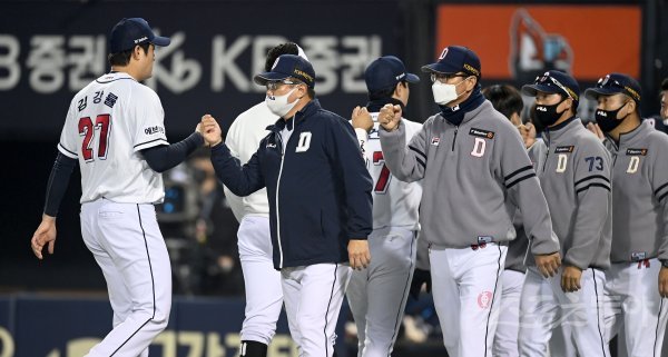 26일 서울 잠실야구장에서 ‘2021 신한은행 SOL KBO리그’ 키움 히어로즈와 두산 베어스 경기가 열렸다. 7-2 승리를 거둔 후 두산 김태형 감독이 선수들과 하이파이브 하고 있다.