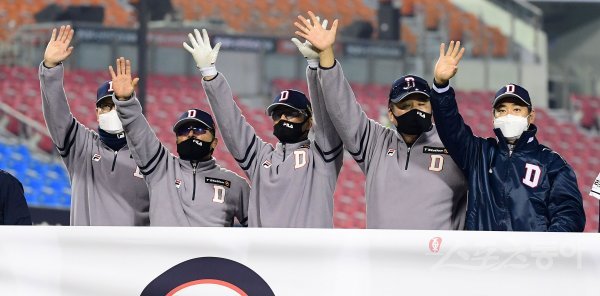 26일 서울 잠실야구장에서 ‘2021 신한은행 SOL KBO리그’ 키움 히어로즈와 두산 베어스 경기가 열렸다. 시즌 홈 마지막 경기를 승리한 두산 김태형 감독과 코치들이 팬들에게 인사하고 있다.
