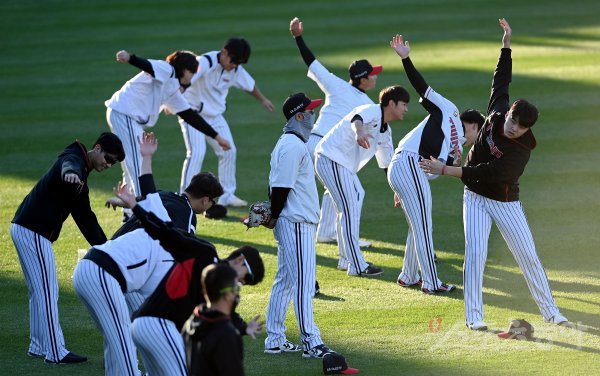 27일 대전 한화생명이글스파크에서 ‘2021 신한은행 SOL KBO리그’ 한화 이글스와 LG 트윈스의 경기가 열린다. 경기 전 LG 선수들이 외야에서 몸을 풀고 있다.