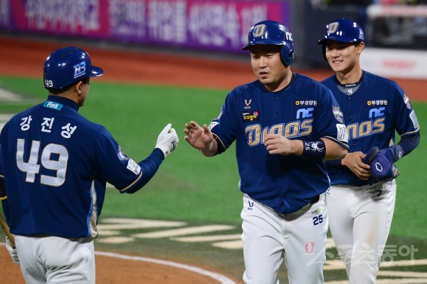 27일 경기도 수원KT위즈파크에서 열린 ‘2021 신한은행 SOL KBO리그’에서 KT 위즈와 NC 다이노스의 경기에서 1회초 1사 2, 3루 NC의 좌전 적시타 때 2루주자 양의지가 득점에 성공한 뒤 동료와 기쁨을 나누고 있다.