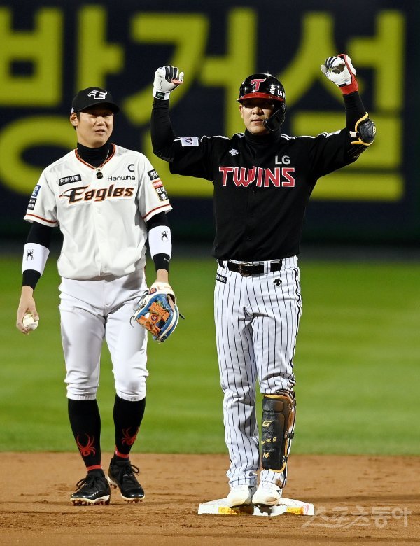 27일 대전 한화생명이글스파크에서 ‘2021 신한은행 SOL KBO리그’ 한화 이글스와 LG 트윈스의 경기가 열렸다. 1회초 2사 1, 2루에서 LG 김민성이 2타점 2루타를 날린 뒤 환호하고 있다. 대전 | 김민성 기자 marineboy@donga.com