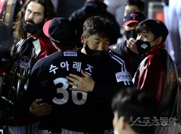 27일 대전 한화생명이글스파크에서 ‘2021 신한은행 SOL KBO리그’ 한화 이글스와 LG 트윈스의 경기가 열렸다. 5회까지 한화 공격을 무실점으로 막은 LG 선발 수아레즈가 이닝 종료 후 김현수와 포옹을 나누고 있다. 대전 | 김민성 기자 marineboy@donga.com