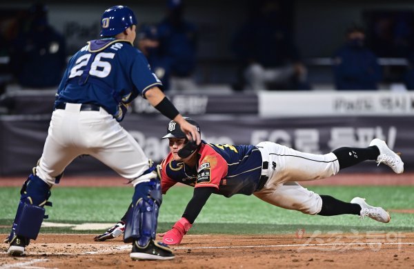 27일 경기도 수원KT위즈파크에서 열린 ‘2021 신한은행 SOL KBO리그’에서 KT 위즈와 NC 다이노스의 경기에서 3회말 1사 2루 KT의 좌전 적시타 때 2루주자 배정대가 홈으로 파고들어 세이프 되고 있다.