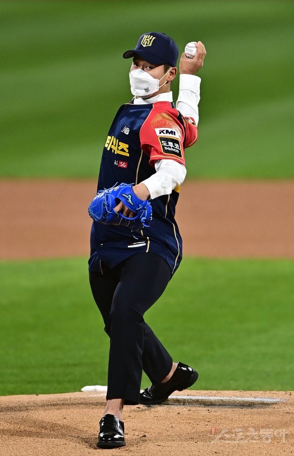 27일 경기도 수원KT위즈파크에서 열린 ‘2021 신한은행 SOL KBO리그’에서 KT 위즈와 NC 다이노스의 경기에 앞서 KT 2021 신인 선수 박영현이 승리 기원 시구를 하고 있다.