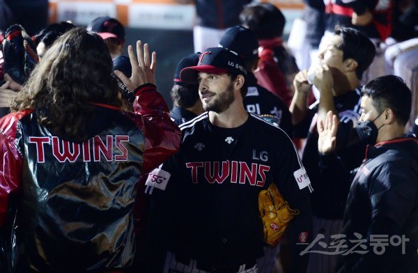 27일 대전 한화생명이글스파크에서 ‘2021 신한은행 SOL KBO리그’ 한화 이글스와 LG 트윈스의 경기가 열렸다. 5회까지 한화 공격을 무실점으로 막은 LG 선발 수아레즈가 이닝 종료 후 동료들의 환영을 받고 있다. 대전 | 김민성 기자 marineboy@donga.com