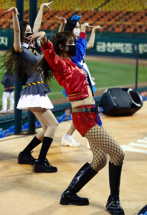 27일 대전 한화생명이글스파크에서 ‘2021 신한은행 SOL KBO리그’ 한화 이글스와 LG 트윈스의 경기가 열렸다. 한화 치어리더가 화려한 공연을 선보이고 있다.