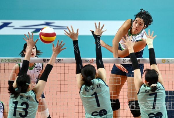 27일 서울 장충체육관에서 열린 ‘2021~2022 도드람 V-리그’ 여자부 GS칼텍스와 현대건설 경기에서 현대건설 야스민이 GS칼텍스의 블로킹 사이로 스파이크를 날리고 있다.