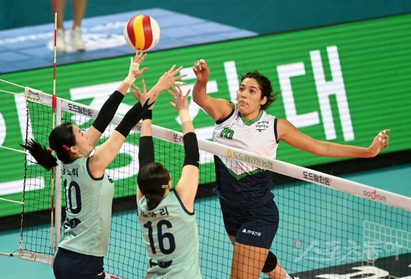27일 서울 장충체육관에서 열린 ‘2021~2022 도드람 V-리그’ 여자부 GS칼텍스와 현대건설 경기에서 현대건설 야스민이 GS칼텍스의 블로킹 사이로 밀어넣기 공격을 있다.