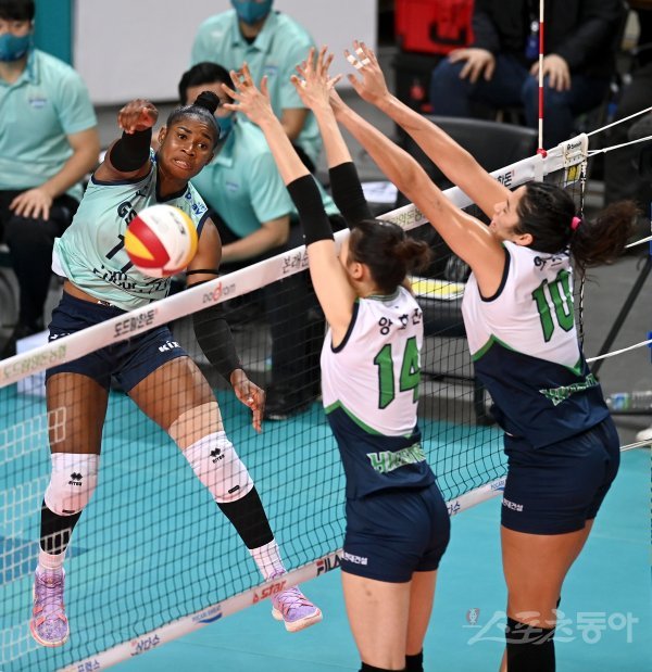 27일 서울 장충체육관에서 열린 ‘2021~2022 도드람 V-리그’ 여자부 GS칼텍스와 현대건설 경기에서 GS칼텍스 모마가 현대건설의 블로킹 사이로 스파이크를 날리고 있다. 장충 | 김종원 기자 won@donga.com