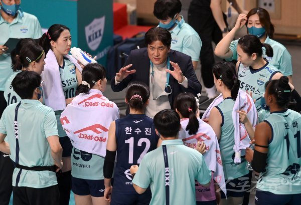 27일 서울 장충체육관에서 열린 ‘2021~2022 도드람 V-리그’ 여자부 GS칼텍스와 현대건설 경기에서 GS칼텍스 차상현 감독이 작전 지시를 하고있다. 장충 | 김종원 기자 won@donga.com