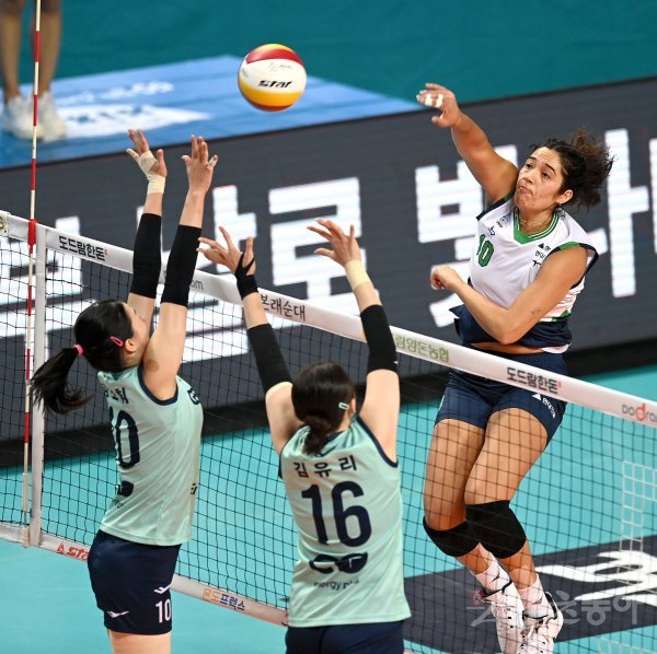 27일 서울 장충체육관에서 열린 ‘2021~2022 도드람 V-리그’ 여자부 GS칼텍스와 현대건설 경기에서 현대건설 야스민이 GS칼텍스의 블로킹 사이로 스파이크를 날리고 있다.