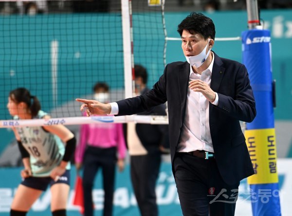 27일 서울 장충체육관에서 열린 ‘2021~2022 도드람 V-리그’ 여자부 GS칼텍스와 현대건설 경기에서 현대건설 강성형 감독이 작전 지시를 하고 있다.