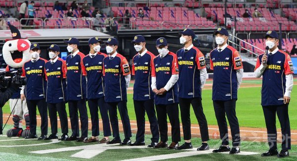 27일 경기도 수원KT위즈파크에서 열린 ‘2021 신한은행 SOL KBO리그’에서 KT 위즈와 NC 다이노스의 경기에서 2021 KT 신인 선수들이 관중석에 인사를 하고 있다.