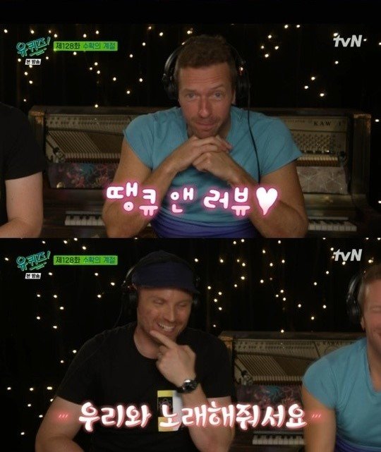 27일 밤 방송된 tvN '유 퀴즈 온 더 블록'에서는 콜드플레이의 조니 버클랜드와 크리스 마틴이 깜짝 등장해 시청자들에게 인사를 건넸다.