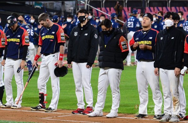27일 경기도 수원KT위즈파크에서 열린 ‘2021 신한은행 SOL KBO리그’에서 KT 위즈와 NC 다이노스의 경기에서 KT가 NC에 6-9로 패한 뒤 선수들이 고개를 숙인 채 아쉬워하고 있다.
