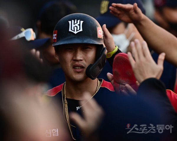 28일 경기도 수원KT위즈파크에서 열린 ‘2021 신한은행 SOL KBO리그’에서 KT 위즈와 NC 다이노스의 더블헤더 1차전 경기에서 4회말 1사 2루 KT의 중전 적시타 때 2루주자 배정대가 득점에 성공한 뒤 더그아웃에서 동료들의 축하를 받고 있다.