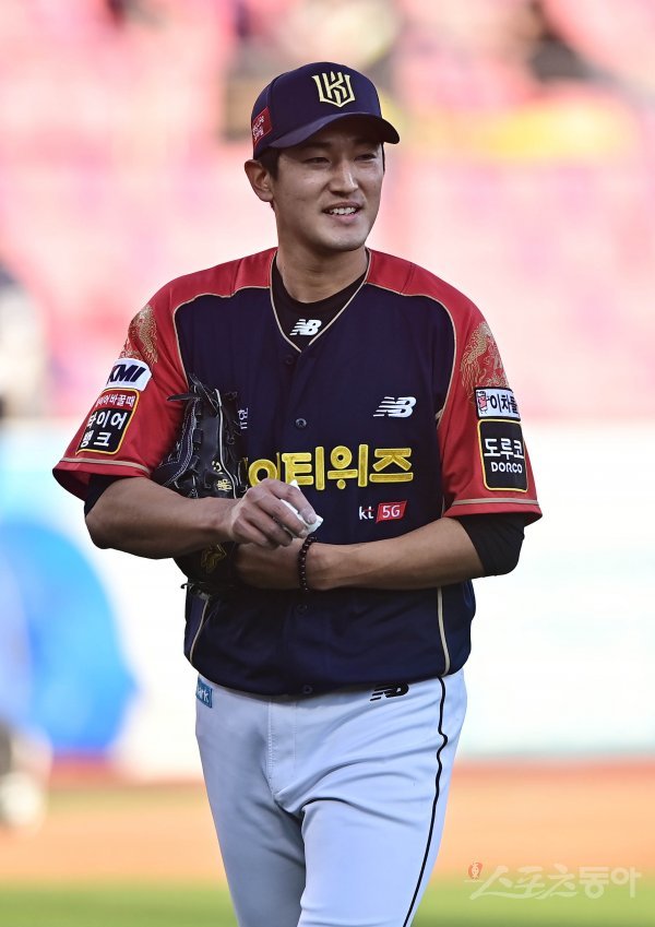 28일 경기도 수원KT위즈파크에서 열린 ‘2021 신한은행 SOL KBO리그’에서 KT 위즈와 NC 다이노스의 더블헤더 1차전 경기에서 5회초 수비를 마친 뒤 KT 고영표가 웃으며 더그아웃으로 향하고 있다.