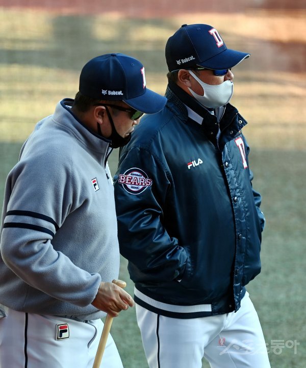 25일 인천 SSG 랜더스필드에서 ‘2021 신한은행 SOL KBO리그‘ SSG 랜더스와 두산 베어스의 경기가 열린다. 경기 전 두산 김태형 감독이 코치와 이야기를 나누고 있다. 인천 | 김민성 기자 marineboy@donga.com