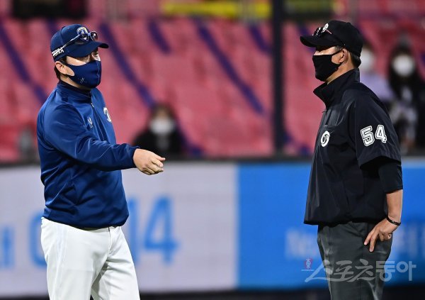 28일 경기도 수원KT위즈파크에서 열린 ‘2021 신한은행 SOL KBO리그’에서 KT 위즈와 NC 다이노스의 더블헤더 1차전 경기에서 9회말 1사 1루 상황에서 NC 이동욱 감독이 심판의 보크 선언에 어필하고 있다.