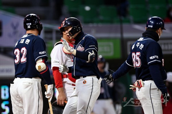 28일 인천 SSG 랜더스필드에서 ‘2021 신한은행 SOL KBO리그’ SSG 랜더스와 두산 베어스의 경기가 열렸다. 6회초 무사에서 두산 박건우가 솔로 홈런을 쏘아 올린 뒤 동료의 환영을 받고 있다.