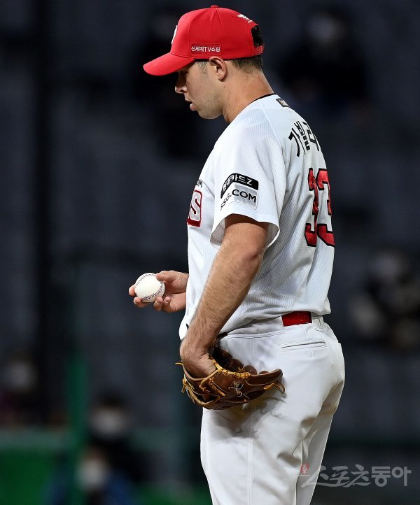28일 인천 SSG 랜더스필드에서 ‘2021 신한은행 SOL KBO리그’ SSG 랜더스와 두산 베어스의 경기가 열렸다. 5회초 1사 2, 3루에서 실점을 허용한 SSG 선발 가빌리오가 아쉬워하고 있다.