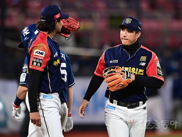 28일 경기도 수원KT위즈파크에서 열린 ‘2021 신한은행 SOL KBO리그’에서 KT 위즈와 NC 다이노스의 더블헤더 2차전 경기에서 7회초 2사 1, 2루 NC의 직선타를 잡은 KT 황재균이 투수의 축하를 받고 있다. 수원 | 주현희 기자 teth1147@donga.com
