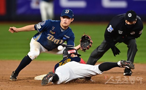 28일 경기도 수원KT위즈파크에서 열린 ‘2021 신한은행 SOL KBO리그’에서 KT 위즈와 NC 다이노스의 더블헤더 2차전 경기에서 6회초 2사 1루 상황에서 NC 2루수 최정원이 KT 1루주자에게 도루를 허용하고 있다. 수원 | 주현희 기자 teth1147@donga.com