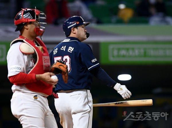 28일 인천 SSG 랜더스필드에서 ‘2021 신한은행 SOL KBO리그’ SSG 랜더스와 두산 베어스의 경기가 열렸다. 8회초 1사 2, 3루에서 두산 양석환이 삼진 아웃으로 물러나고 있다. 인천 | 김민성 기자 marineboy@donga.com
