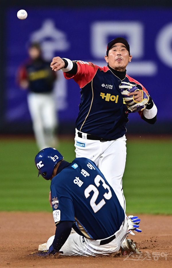 28일 경기도 수원KT위즈파크에서 열린 ‘2021 신한은행 SOL KBO리그’에서 KT 위즈와 NC 다이노스의 더블헤더 2차전 경기에서 6회초 1사 1루 NC의 내야 땅볼 때 KT 2루수 박경수가 1루주자를 포스 아웃시킨 뒤 1루로 송구하고 있다. 수원 | 주현희 기자 teth1147@donga.com