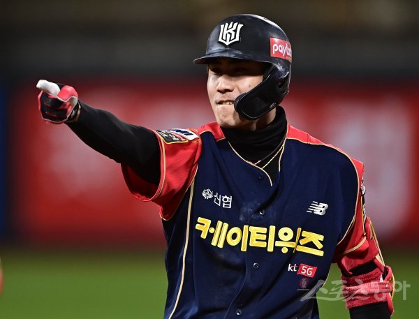 28일 경기도 수원KT위즈파크에서 열린 ‘2021 신한은행 SOL KBO리그’에서 KT 위즈와 NC 다이노스의 더블헤더 2차전 경기에서 7회말 1사 2루 KT 심우준이 1타점 좌전 적시타를 쳐낸 뒤 세리머니를 하고 있다. 수원 | 주현희 기자 teth1147@donga.com