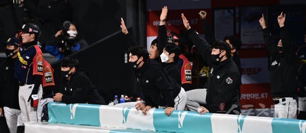 28일 경기도 수원KT위즈파크에서 열린 ‘2021 신한은행 SOL KBO리그’에서 KT 위즈와 NC 다이노스의 더블헤더 2차전 경기에서 8회말 1사 KT의 솔로포가 터지자 더그아웃의 선수들이 손을 들어 기뻐하고 있다.