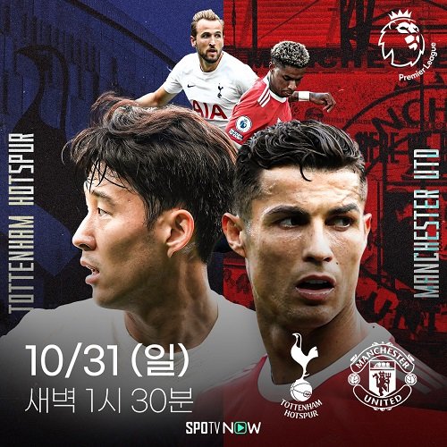 손흥민과 크리스티아누 호날두가 프리미어리그에서 만난다. 31일 일요일, 21-22 프리미어리그 10라운드에서 토트넘 대 맨유 경기가 펼쳐진다. PL 최고의 등번호 7번으로 꼽히는 두 선수 손흥민과 호날두가 맞붙게 되어 관심이 모인다. 특히 불안한 성적으로 경질 위기에 놓인 누누 에스피리투 산투와 올레 군나르 솔샤르 감독 맞대결로도 흥미를 끄는 이번 경기는 31일 일요일 새벽 1시 30분 스포티비(SPOTV)에서 생중계되며, PC/모바일 중계는 스포티비 나우(SPOTV NOW)에서 만날 수 있다.